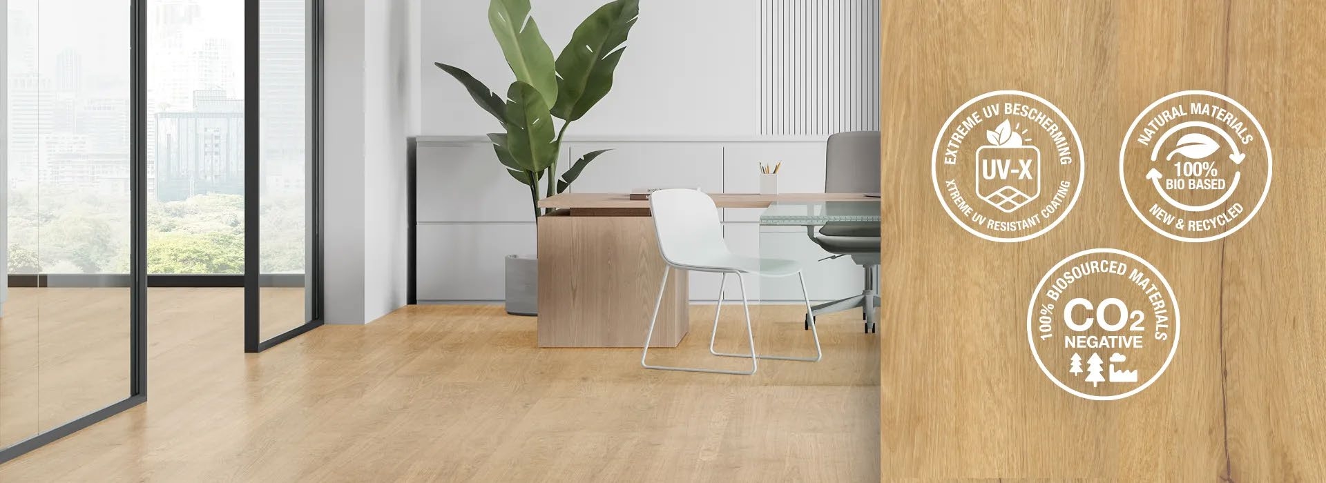 Wat dit biobased programma echt uniek maakt, is het assortiment van niet alleen klik-, maar ook lijmproducten, het dominante product op de projectmarkt in de Benelux. Beide producten zijn nu verkrijgbaar met verbluffend authentieke hout- en steenprints dankzij geavanceerde directe digitale printtechnologie. Dit maakt deze biobased producten de eerste in hun soort die nu ook beantwoorden aan de ‘visuele en design’-behoeften van het overgrote deel van de markt.